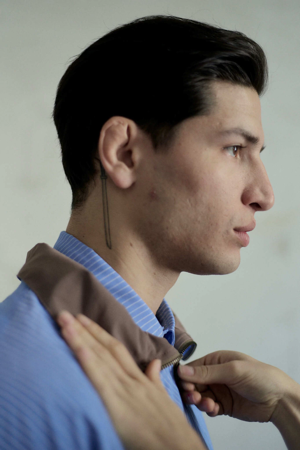 Campera bomber reversible confeccionada de un lado con impermeable marrón y del otro con camisero rayado. Bolsillos laterales. Terminación en cintura y puños con elástico.
