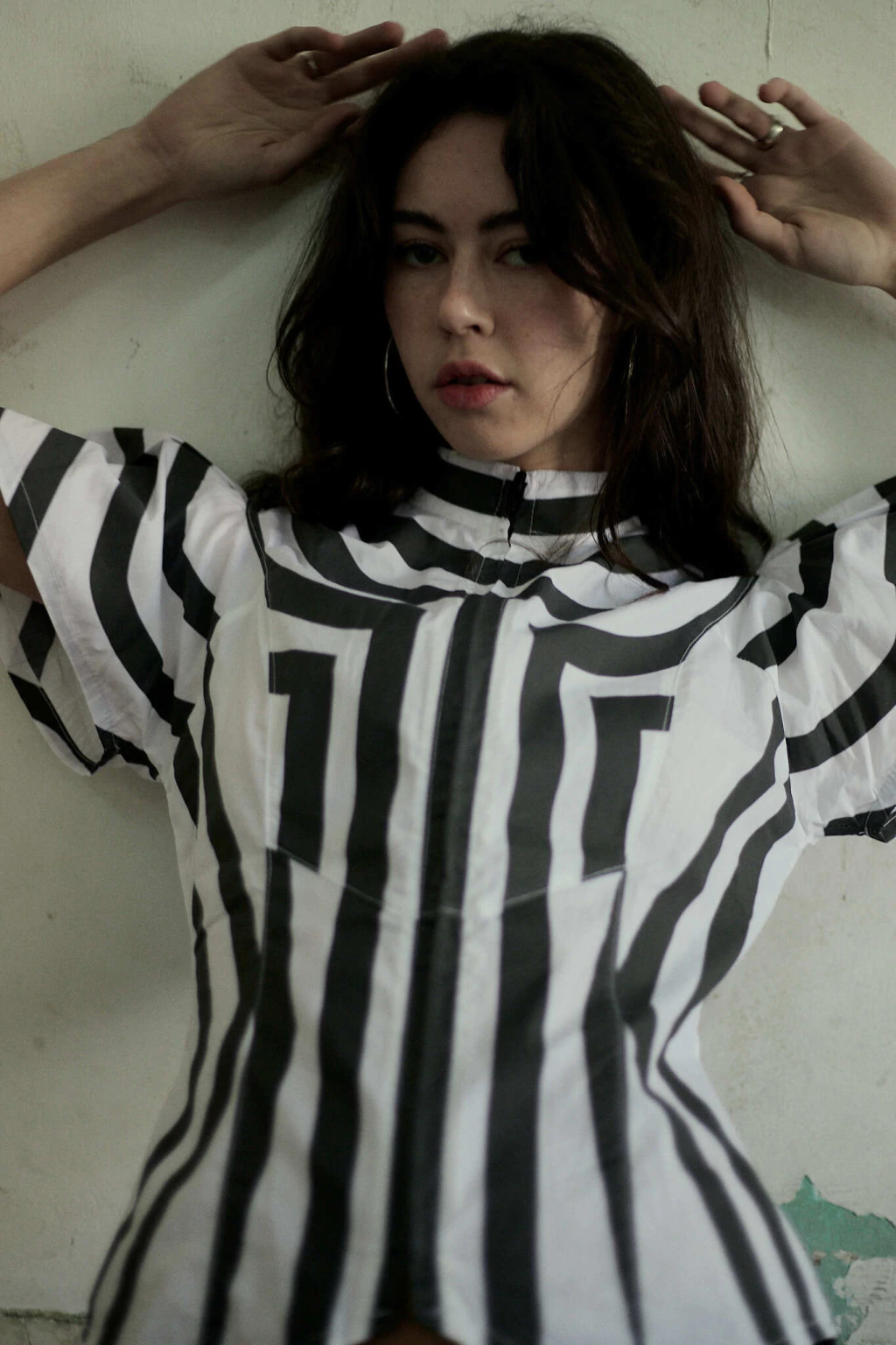 Camisa de poplin 100% algodón estampado, con silueta entallada tipo corset en la parte inferior, mangas cortas con volumen y cierre en el delantero.